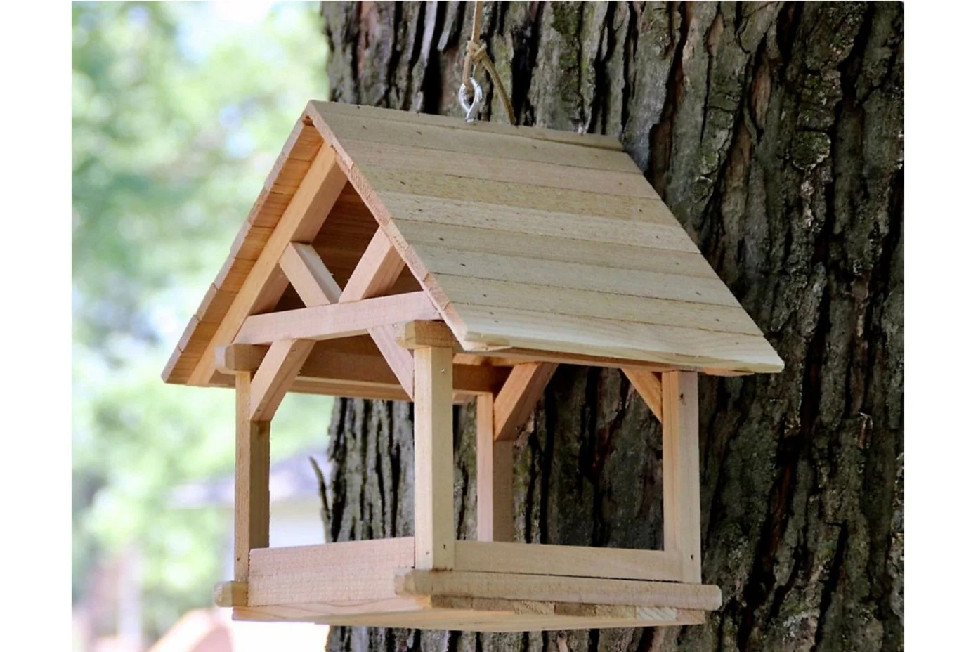 When some customers inquired if we could make a larger version of our most popular Bird Feeder, we thought, “That’s a great idea!” Like the original, this one too is reminiscent of old time Picnic shelters where families would gather together. Handcrafted from Cedar, this functional, yet decorative Bird Feeder will be a beautiful addition to your Yard or Garden! (No post or hooks included. Recommended to screw down to porch rail or post as it is lightweight.- 2lbs, 13oz.)
